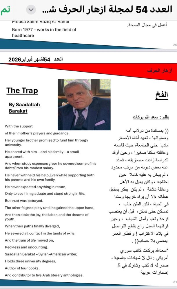 (( بمساندة من دولاب أمه وصلواتها ، تعهد أخاه الأصغر ماديا حتى الجامعة، حيث قاسمه وعائلته سكنا صغيرا ، وحين أوفد للدراسة زادت مصاريفه ، فسدّد عنه بعض ديونه من مرتب محدود ، لم يبخل به عليه كاملا حين احتاجه ، وكان يعيل به الأهل وعائلة ناشئة ، لم يكن يفكر بمقابل عطائه ،إلا أن يراه خريجا وسندا في الحياة ، لكن الظن خاب ، تمسكن حتى تمكن، قبل أن يغتصب فرحة وتعبا وآمال الشباب ، وحين فرقّتهما السبل ،راح يقطع التواصل في بلاد الاغتراب ! و قطار العمر يمضي بلا حساب))