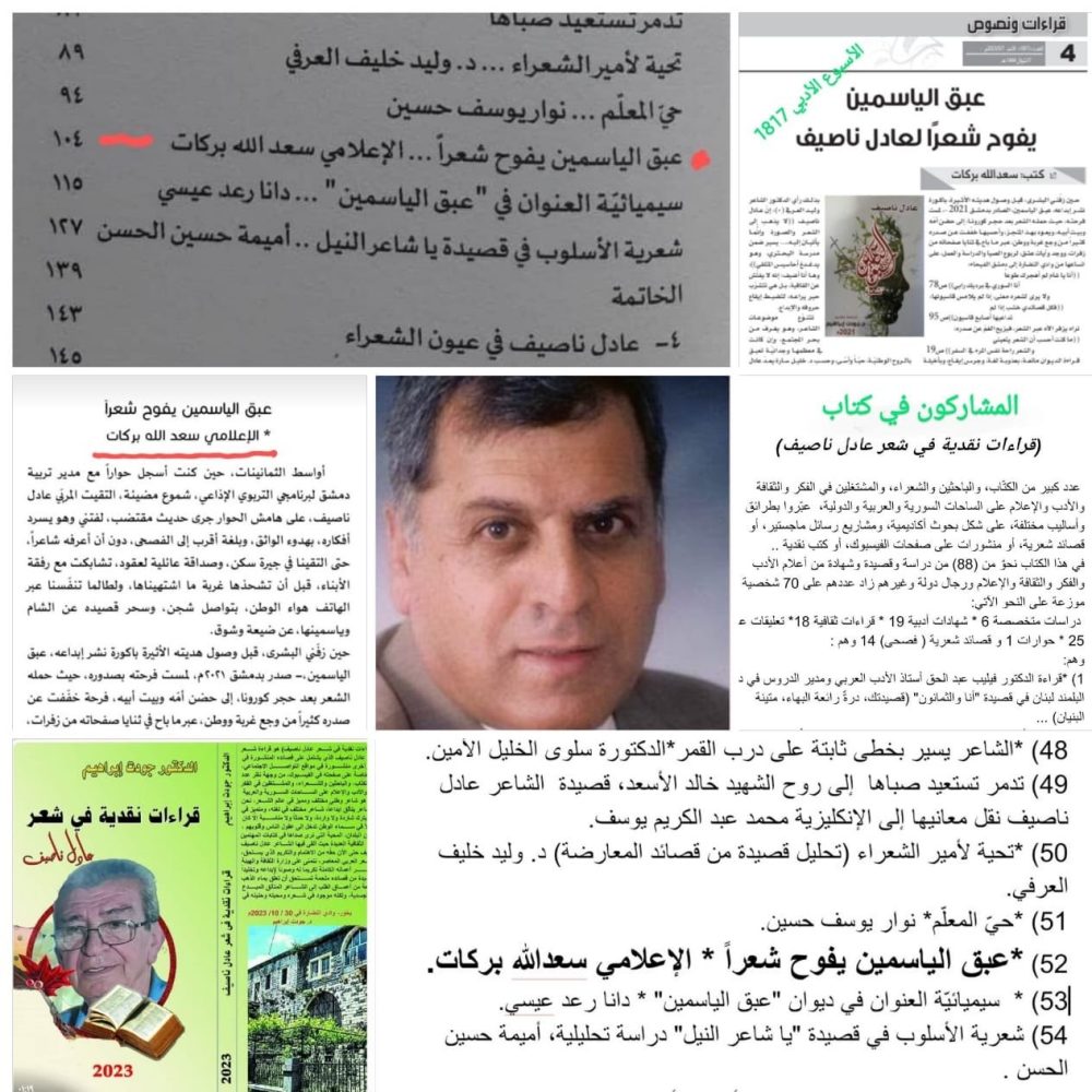بلا تكلّف ، أوتصنّع ، ومن دون تنمّق ، يغوص عادل ناصيف في عمق موضوعاته ، تراه يحلّق في فضاء العصور الشعريّة ، فيما يخاطبه الأديب عيسى فتوح :(( ديوانك بوح الياسمين …خير برهان ،على صدق شاعريتك الطلقة ، كربيع قريتك الكيمة التي تفخر بهذه الشاعرية العذبة التي هي امتداد لشاعرية كل من الأخطل الصغير وسعيد عقل وعمر أبو ريشة )).
