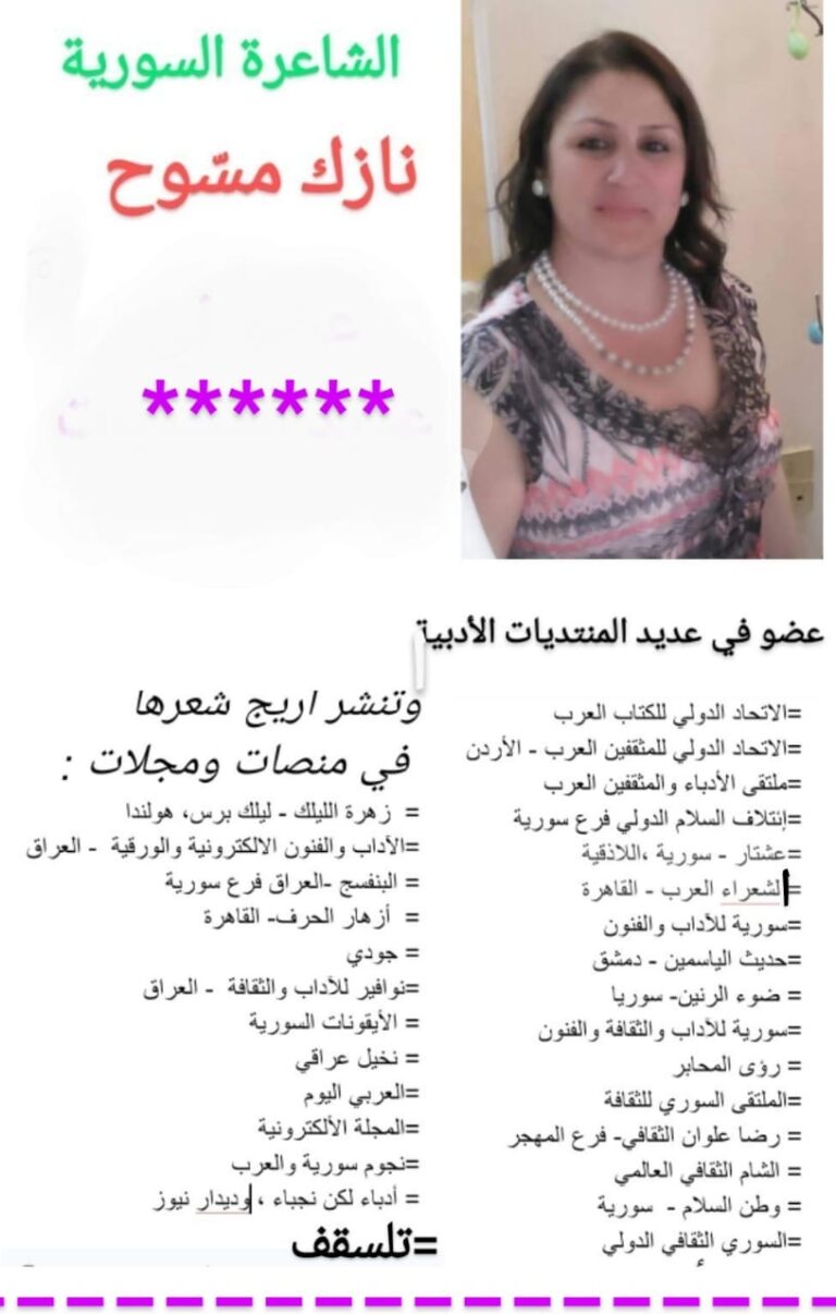 نازعتني روحي إليك نازَعتْني روحي إليك شَوقاً حُباً.. شغفاً فَزِدتُ بِكَ نَحواً وصَرفاً يقيناً وإيماناً ديناً وعرفاً حتى صِرتُ ضميراً وأخرى مُضافاً إليك فبِكَ ترتسمُ كل أغنياتي تتمّلكَني رغبةٌ جامحة بأن أنجُب من عينيك قصيدة..! نتقاسم فيها مواسِم الغِياب أُزيدُكَ…