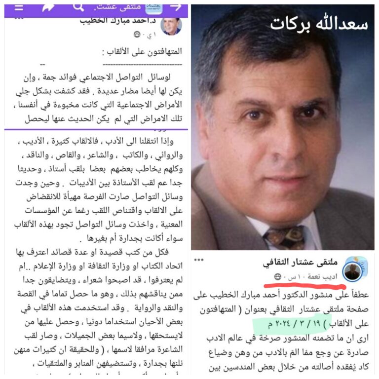ثقافة الفيسبوك بين التحفيز والمجاملات * بقلم الكاتب الإعلامي سعدالله بركات # في مقالته عن التهافت على الألقاب ، التي نشرها في صفحة ملتقى عشتار الثقافي، [ ١٩ / ٣ / ٢٠٢٤ م] ،عزف د. أحمد مبارك الخطيب…